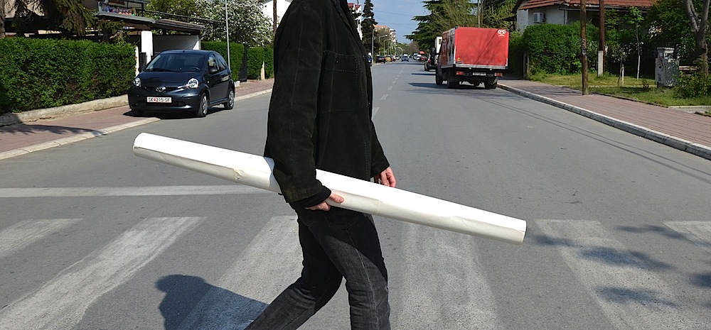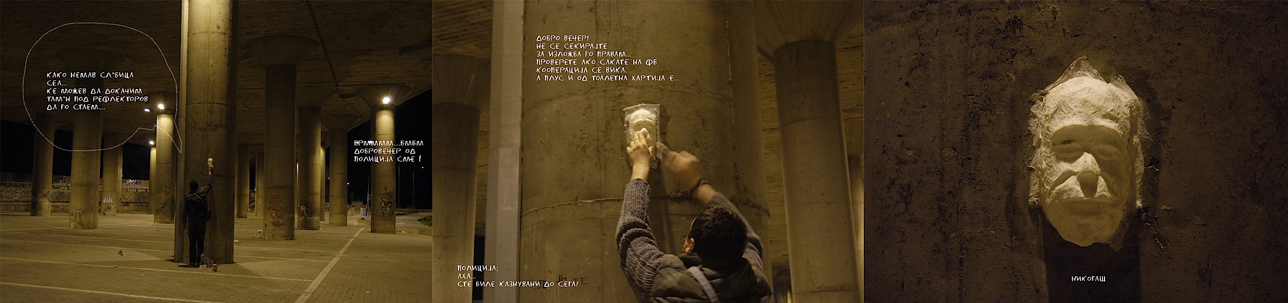 Авторот миметички се идентификува со скулптурата на Филип 2 држејќи свијок со негови текстови кои се пародија на проектот Скопје 2014. Текстовите, кои претходно беа објавени на социјалните мрежи, предизвикаа контрадикторни реакции во јавните медиуми кои погрешно ги реинтерпретирале истите како про-владина поддршка.