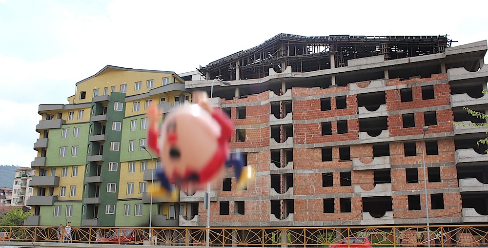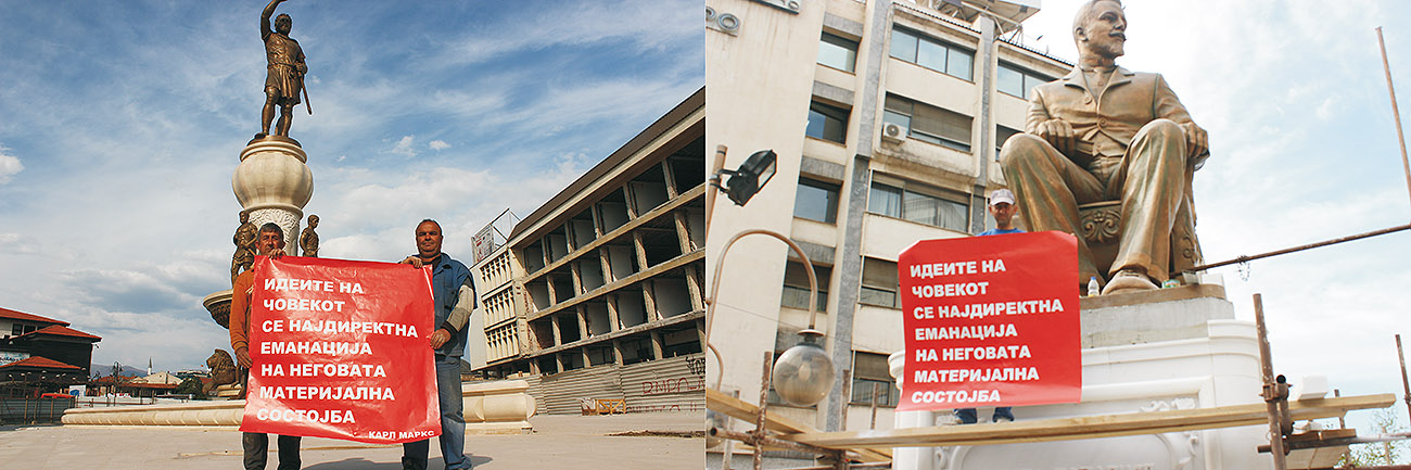 Фотографирање на работници коишто работат на изградба на дел од објектите на проектот Скопје 2014 со текст/цитат од Карл Маркс. Акцијата претставува „упад” во идејата за капиталистичкото планирање на центарот на град Скопје.