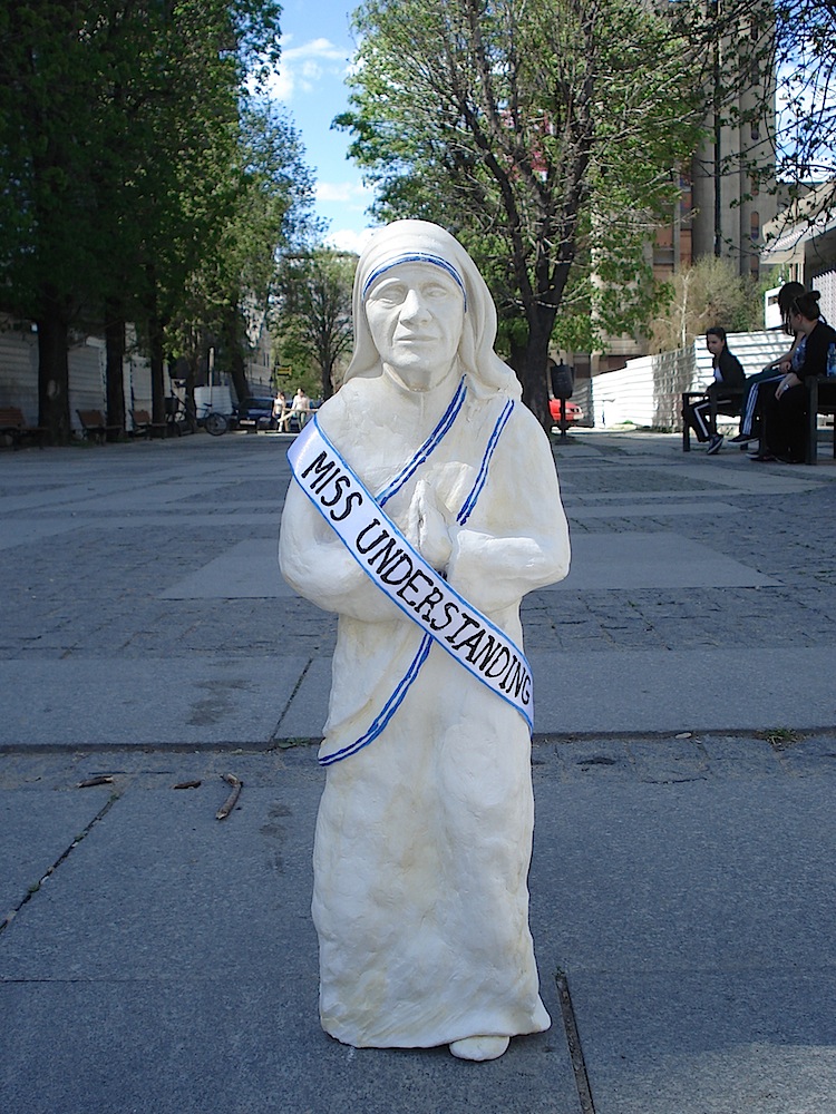 На местото на кое се планира новиот монструозен споменик на Мајка Тереза финансиран од Субрата Рој, поставувам фигура на Мајка Тереза. Претставувањето на Мајка Тереза како Мис е моја реакција на кичизирањето, банализирањето и дисторзирањето на споменот за неа (почнувајќи од гореспоменатата спомен-куќа) што треба да кулминира со овој триесетметарски квазинадреалистичко-боливудски споменик. Miss Understanding зборува за едно големо misunderstanding кое брзо и сигурно го претвора овој град во некој друг.