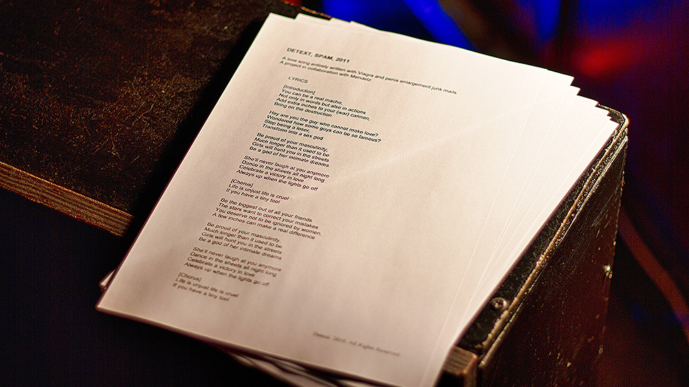 Детекст (Раул МАРТИНЕЗ и Валентин ДУЧЕА), Spam, 2011, звучна инсталација. Повеќе за делото
