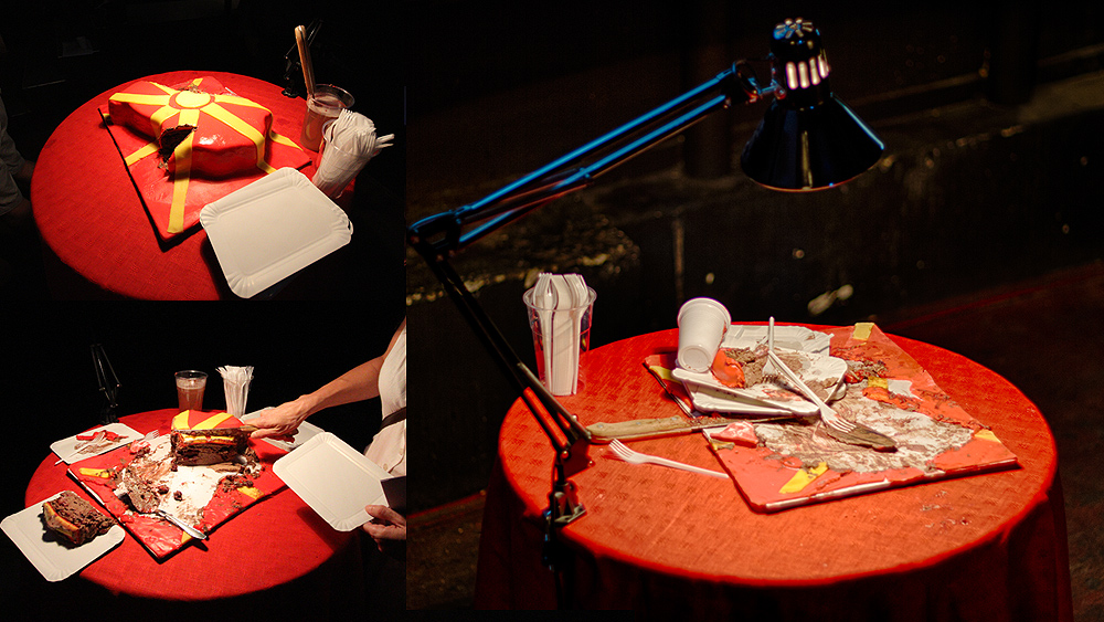 Владимир ЛУКАШ, „Делете ја, парчете ја!”, 2014, торта, хартиени чинии, кујнски прибор