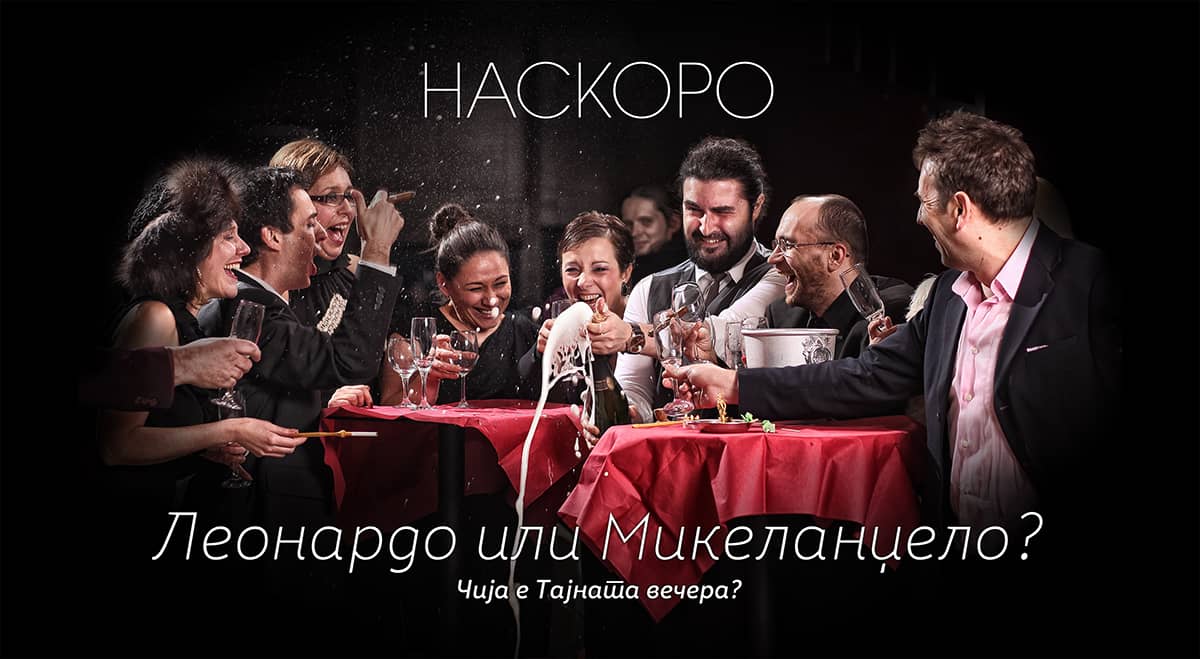 Leonardo or Michelangelo? is an event that took place in the Museum of Contemporary Art in Skopje, in December 2012. The invitation for the event was sent along with a dress code and addressed only to selected audience, chosen among the regular visitors to cultural events. Accepting the invitation, the visitors undertook the role of performers and participated in several hours photo session. The outcome of it is set of images, full of exaggerated simulations of celebratory atmosphere, status symbols, mise-en-scène of rich cocktail party and fun around gambling objects. The emphasis was given to the moments that mimic ecstasy, decadence, stereotypes of both gender and status roles, etc.