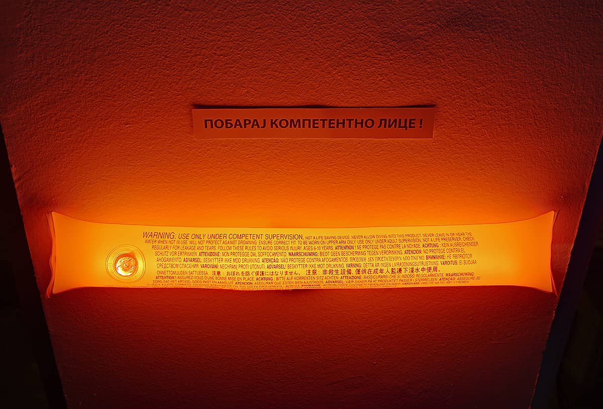 An inflatable object (slightly modified ready-made) with printed text on the biggest part of its surface. The text is consisted of invasive warning yet confusing messages what the object’s function is not, accompanied by the cautions for the need of the competent supervision while using the object.
