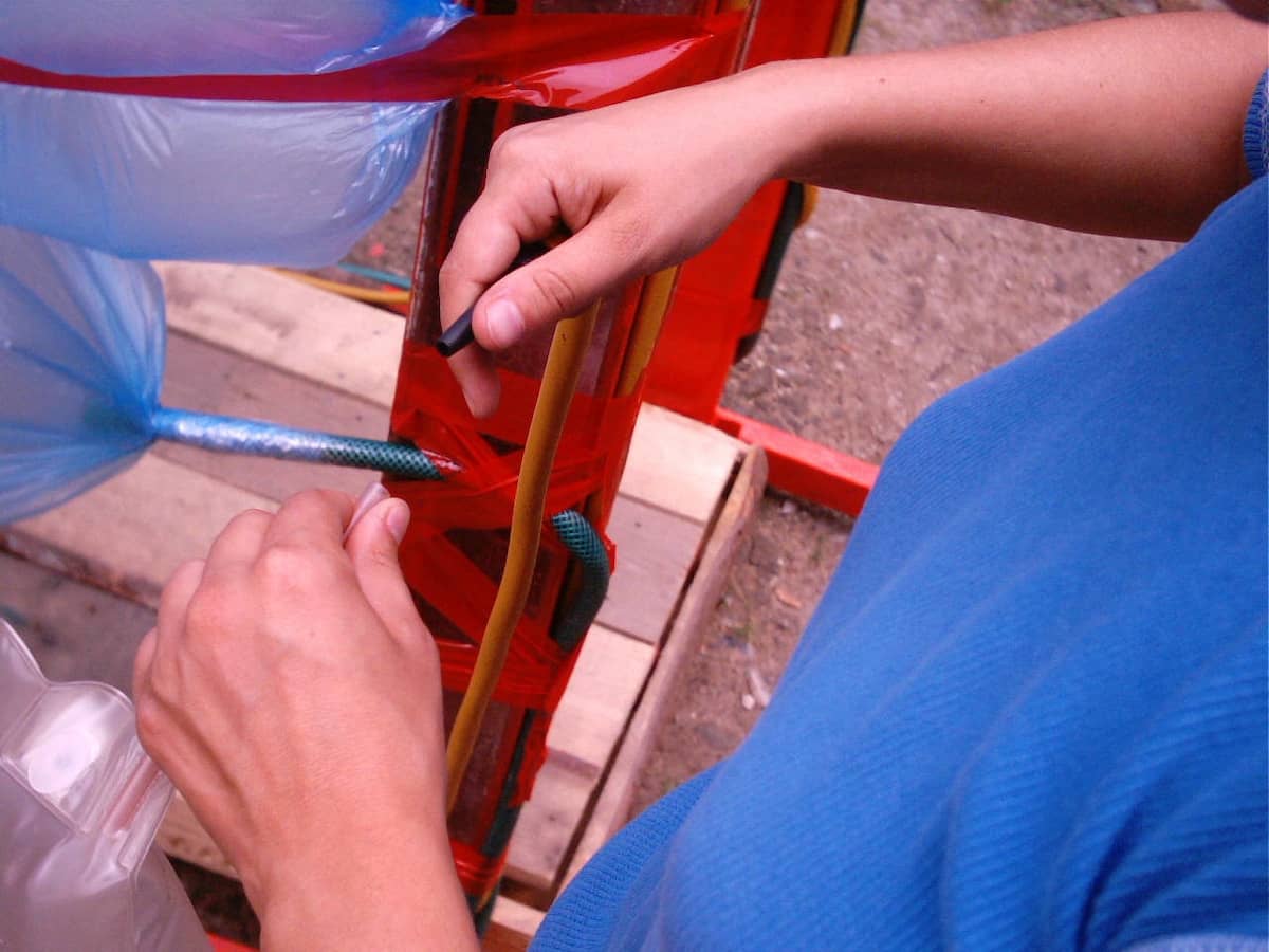 The work was developed for the Art Festival of International Collaborations held at C.E.S.T.A., Tabor, Czech Republic. It consists of a wooden floor structure, built-in air pumps and walls made of plastic air balloons. With each step on the floor of the object, the balloons inflate narrowing the tunnel. The two OPA members standing on both ends of the tunnel perform a complicated coin exchange operation involving both Czech and US currency.
