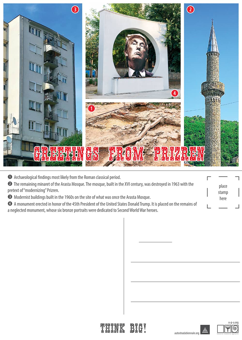 “Think Big! is a monument to the new type of leader. It is placed in the center of Prizren, on a site where three different levels of meaning intersect. Architectural remains as evidence of three distant eras, cultures and ideologies overlap each other, while sharing mutual territories: The archaeological findings from the Roman classical period (II-III century); the minaret of what was once the Arasta Mosque, built in the XVI century and destroyed in 1963 on the pretext of modernizing Prizren; and, the modernist buildings constructed in the 1960s in place of the Arasta Mosque.