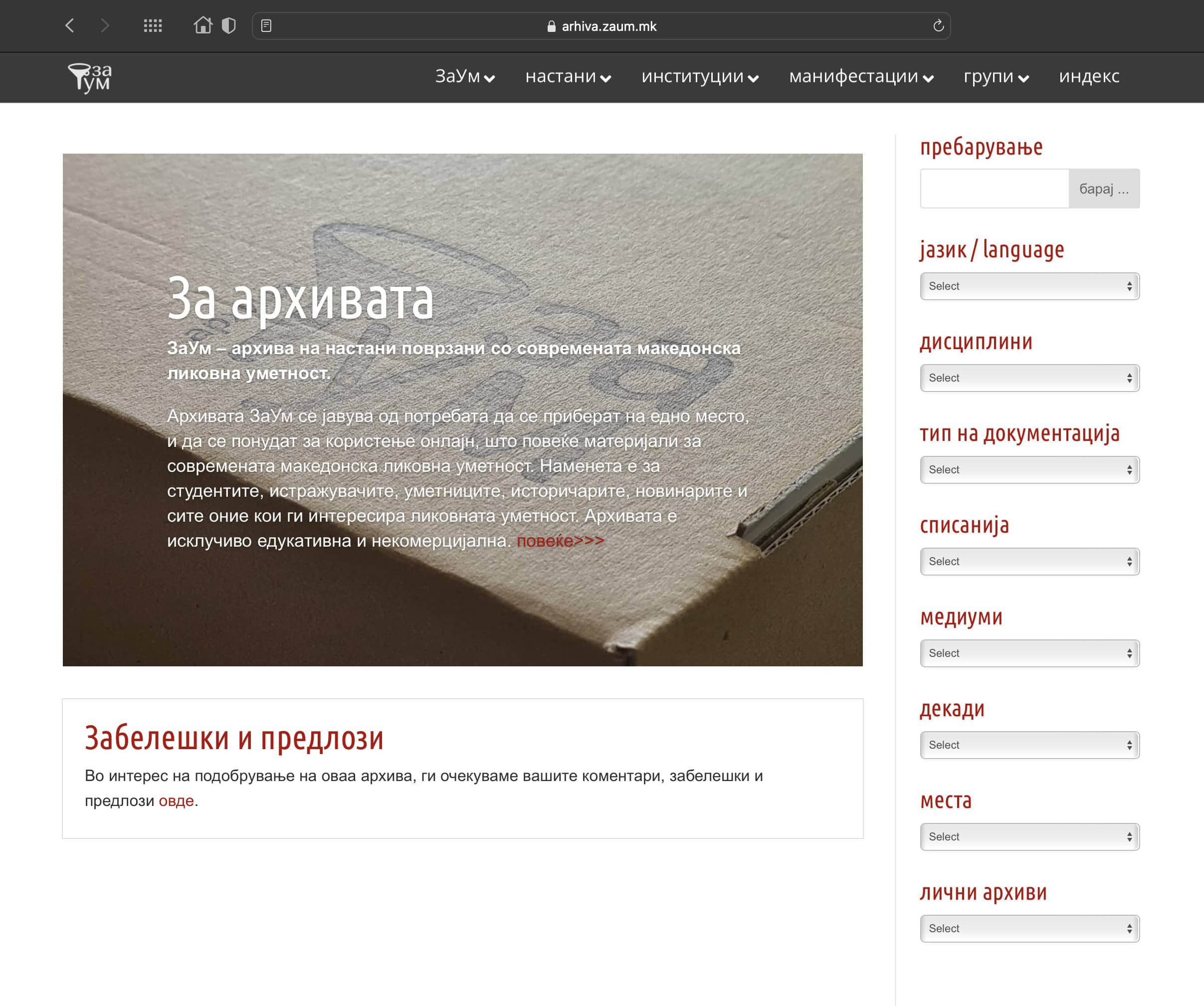 So far under this name we developed the long-term project ZaUm Archive – an open online archive of Macedonian art. For several years we have been digitizing secondary materials related to modern and contemporary Macedonian art, such as catalogs, articles, VHS tapes, etc., many of them in the state of disappearing.