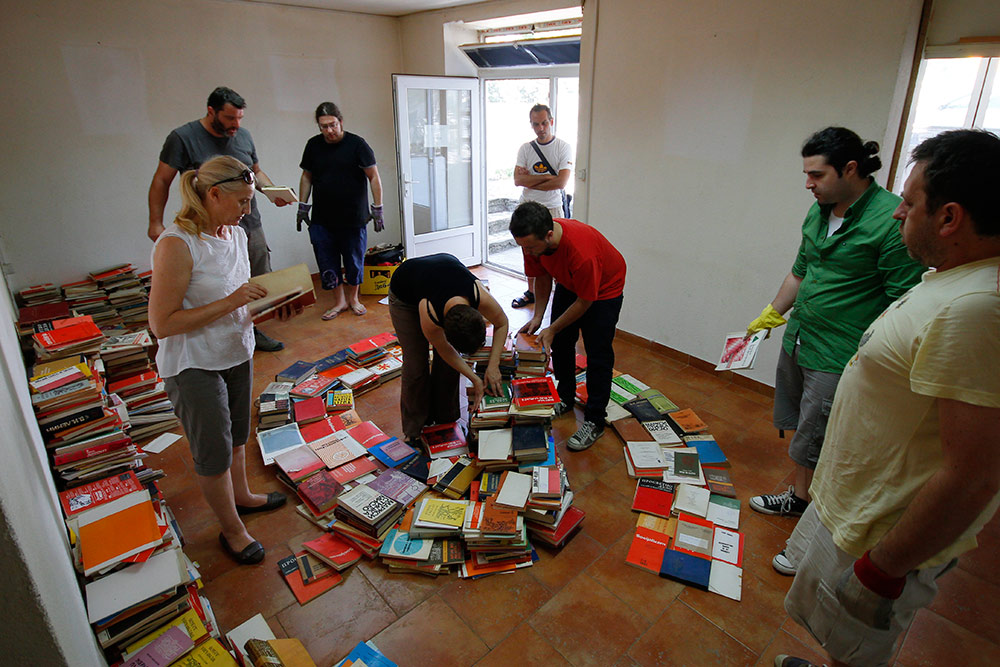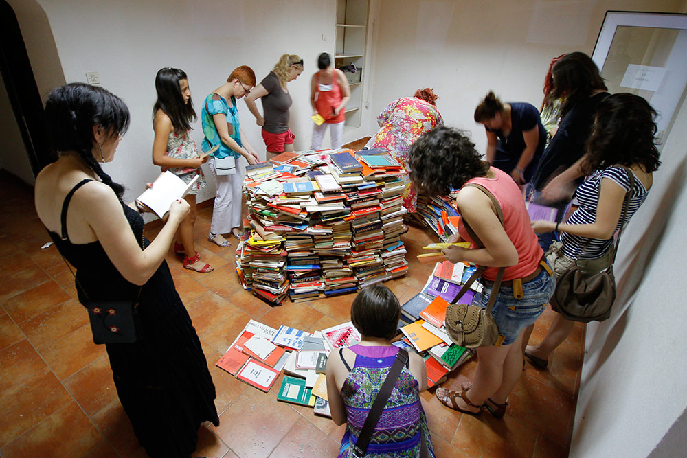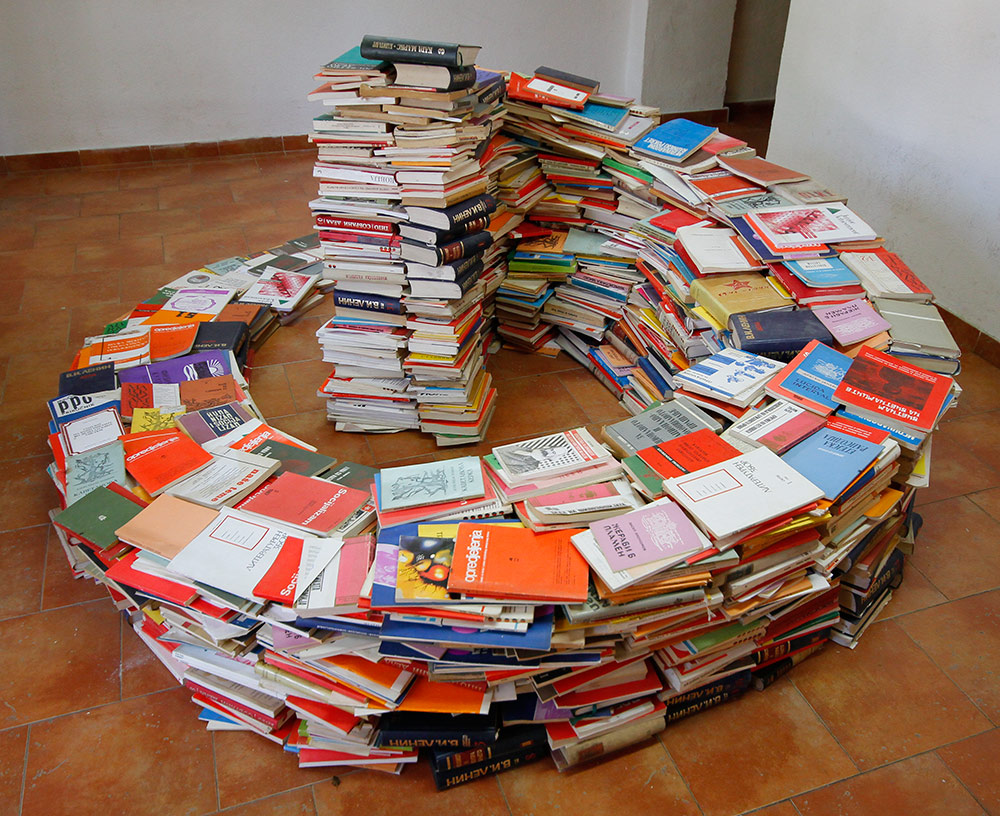 But the question remains – what then? The book is not here to rot in the warehouse, but its treasures need to switch hand to hand, to be shared, the word to be scattered as seed in the fields… Following the idea of the initiative KOOPERACIJA, we now have the opportunity to offer all interested and curious one really original way to enrich their personal library, participating in the creation of a sculptural work. The combination of an art installation and the free distribution of books by the participation of the audience as a living and fluctuating matter is a unique and exciting act of bridging the gap between Word and Deed.
